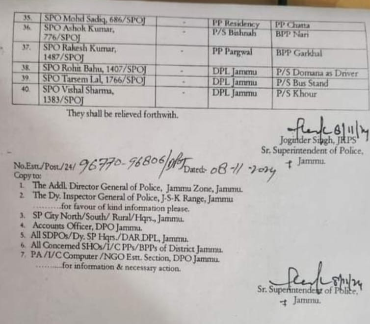 40 Police personnel Transfer and posting in Jammu and Kashmir,JAMMU, Nov 10: SSP Jammu Joginder Singh orders transfers and postings of 40 Police personnel.