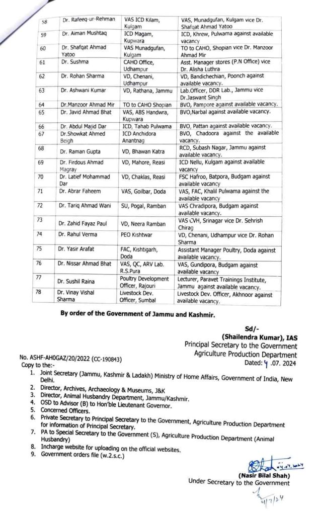 78 Officers in Animal Husbandry Department Transfer and posting in jk July 4, 2024 by Dar ZahoorJuly 04: Jammu and Kashmir Government ordered transfers and postings of 78 Officers in Animal Husbandry Department.WhatsApp Group Join NowAppointment of Central Public Information Officer in the Housing & Urban Development Department 59 Accounts Assistants Transfer and Posting in Jammu and Kashmir list Here. Oplus_131072 Leave a Comment Cancel replyCommentName Email Website Save my name, email, and website in this browser for the next time I comment.