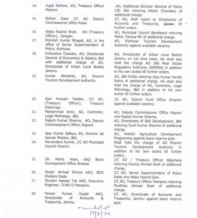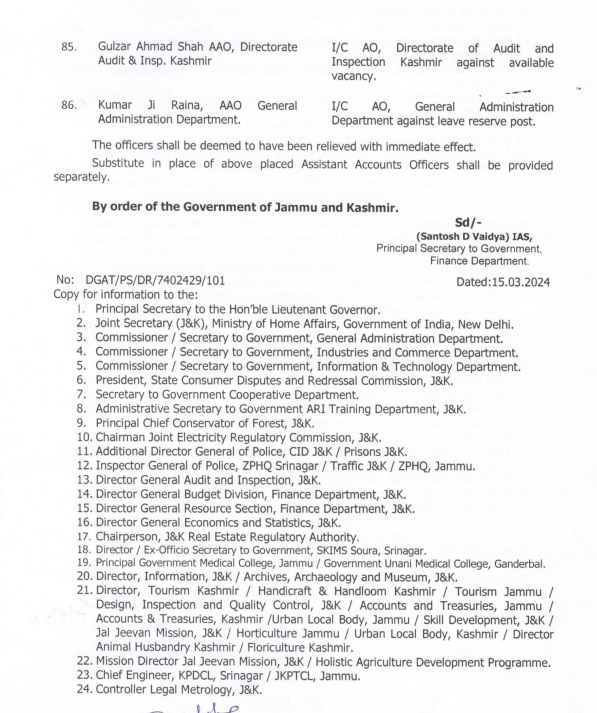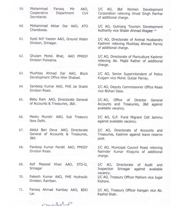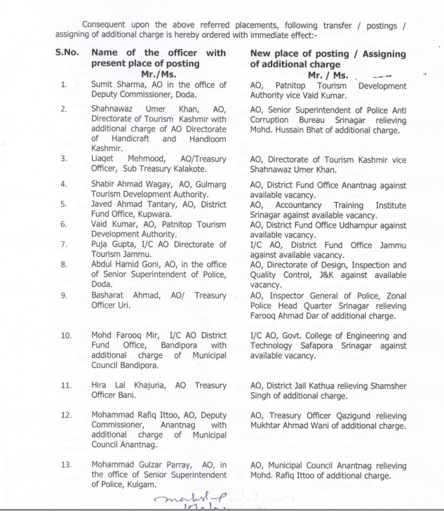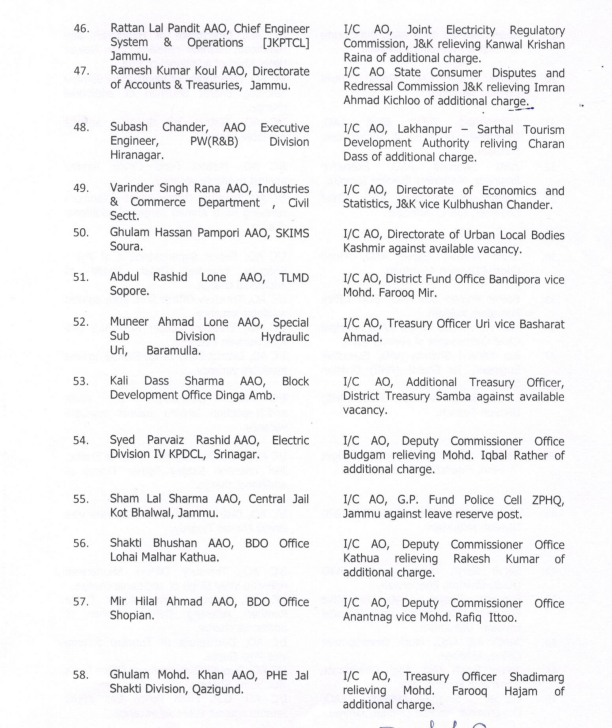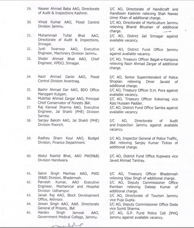 86 Officers Transfers/Postings/Assigning of additional charge in J&K