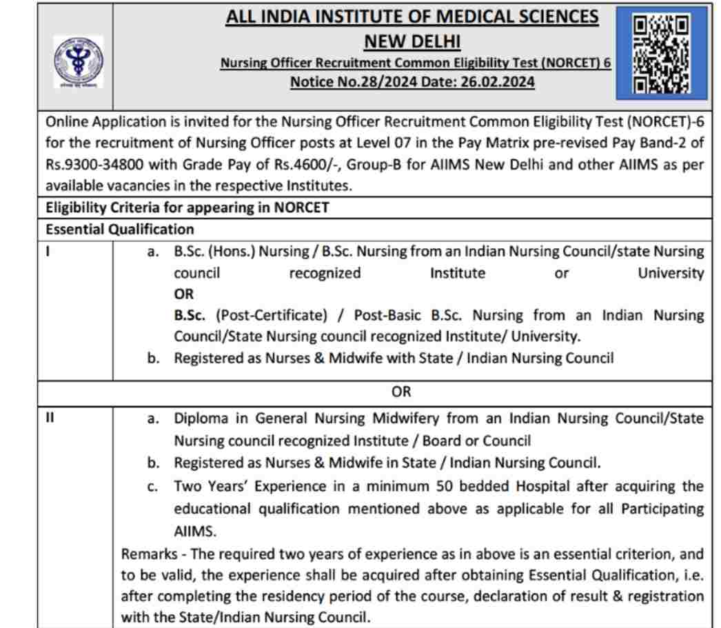 AIIMS Nursing Officer Recruitment 2024: All India Institute of Medical Sciences (AIIMS) has invited Online applications for the Nursing Officer Recruitment Common Eligibility Test (NORCET-6) for the recruitment of Nursing Officer posts. Interested candidates can apply for the Nursing Officer Recruitment Common Eligibility Test online through the official site of AIIMS at aiimsexams.ac.in.