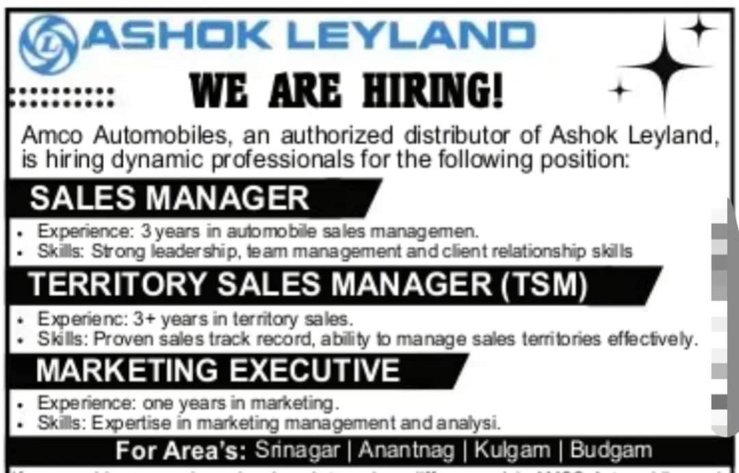 Amco Automobiles, an authorized distributor of Ashok Leyland, is seeking dynamic professionals for the following positions: