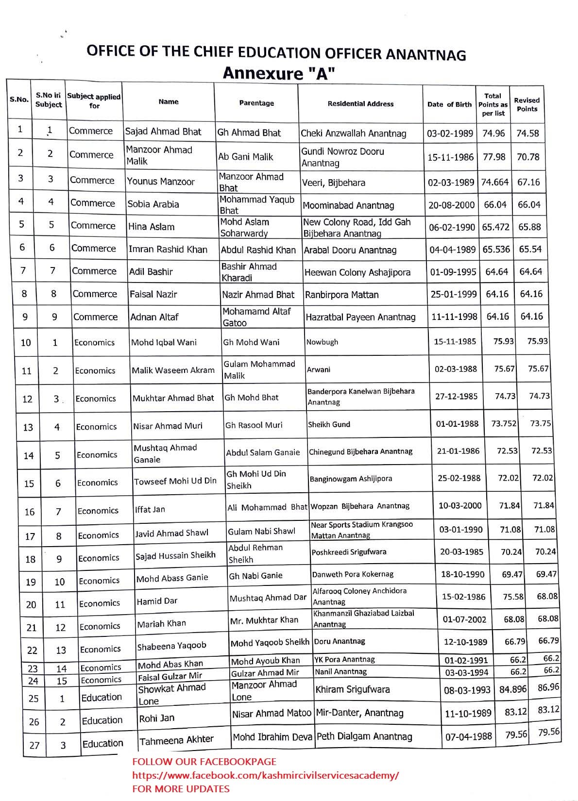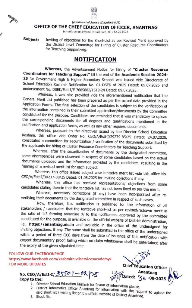 Anantnag: Objections Invited on Revised Merit List for Hiring of Cluster Resource Coordinators September 1, 2025 by Dar ZahoorAnantnag – Inviting of objections for the Short-List as per Revised Merit approved by the District Level Committee for Hiring of Cluster Resource Coordinators for Teaching Support-regWhatsApp Group Join Now Leave a Comment Cancel replyCommentName Email Website Save my name, email, and website in this browser for the next time I comment.