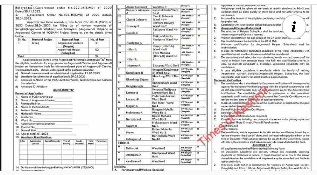 Interested candidates should complete the application forms as per the format provided in Annexure “A” of this notice. Submit the application along with all required documents to the Office of the Child Development Project Officer at Lohal Malhar, Billawar, during working hours. Ensure you obtain a proper receipt for your submission.