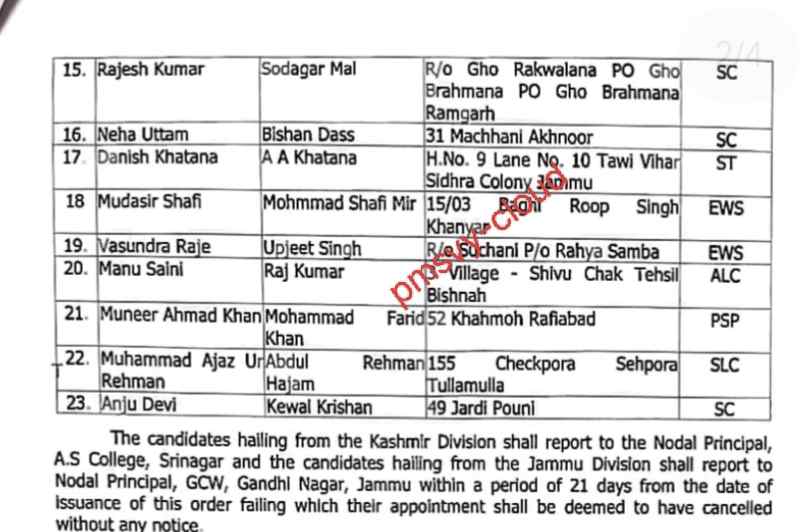 The candidates hailing from the Kashmir Division shall report to the Nodal Prin A.S College, Srinagar and the candidates hailing from the Jammu Division shall repc Nodal Principal, GCW, Gandhi Nagar, Jammu within a period of 21 days from the da Issuance of this order failing which their appointment shall be deemed to have cam without any notice