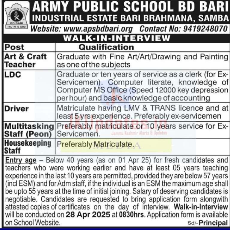APS BD Bari Recruitment 2025: Walk-in Interview for Teaching & Non-Teaching Posts – Apply Now: Army Public School (APS) BD Bari has announced recruitment for various teaching and administrative positions for the year 2025. The school is inviting eligible candidates for a walk-in interview scheduled on 28th April 2025 at 08:30 AM. Interested applicants must bring their duly filled application form along with attested copies of required documents.