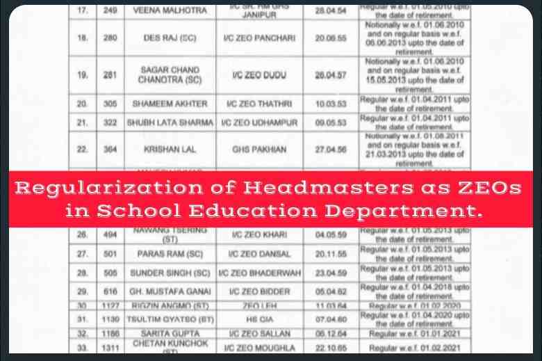 Regularization and Promotion of Headmasters and equivalent in the School Education Department