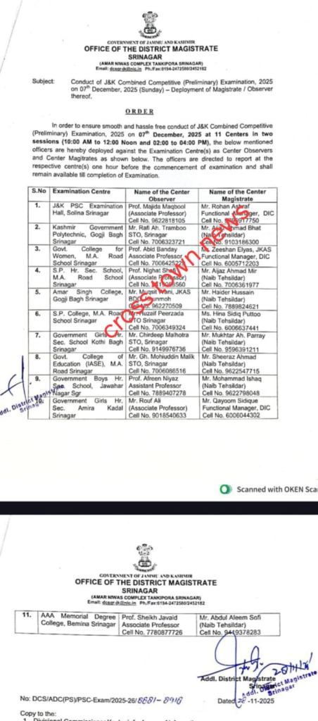 SRINAGAR, Nov 29:DC Srinagar Akshay Labroo ordered for Deployment of Magistrate/Observer for JKAS Exam .