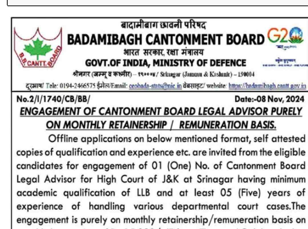 Badamibagh Cantonment Board Recruitment 2024: The Badamibagh Cantonment Board has recently announced the recruitment for the position of Legal Advisor at the High Court of Jammu & Kashmir in Srinagar. This is a fantastic opportunity for qualified legal professionals to work with the Cantonment Board on a monthly retainer basis. Eligible candidates with a minimum qualification of LLB and a substantial background in departmental court cases can apply for this position by submitting an offline application by 29th November 2024.