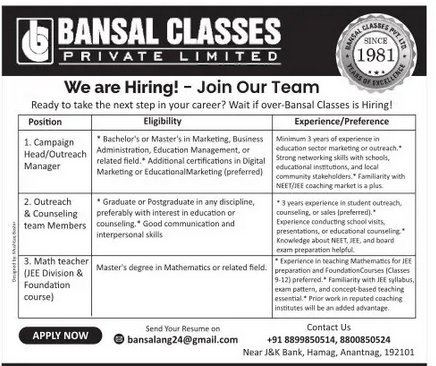 Bansal Classes Careers 2025: Apply Now for Outreach, Counseling & Teaching Roles