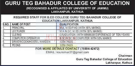 Career Opportunities at Guru Teg Bahadur College of Education: Guru Teg Bahadur College of Education is inviting applications from qualified and dedicated individuals for various positions across academic and non-academic departments. The available vacancies include: