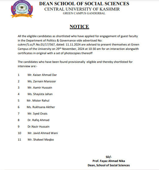 The Central University of Kashmir has released a list of provisionally eligible candidates for the engagement of guest faculty in the Department of Politics & Governance, as per Advertisement No. cukmr/S.sc/F.No.01/17/567, dated 11th November 2024.