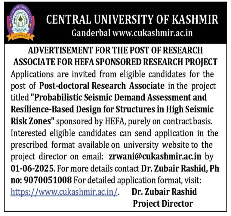 Central University of Kashmir Recruitment 2025: Apply for Post-Doctoral Research Associate Position : The Central University of Kashmir has invited applications for the position of Post-Doctoral Research Associate under a specialized research project. This opportunity is ideal for candidates with a strong academic and research background in seismic risk analysis or structural resilience.