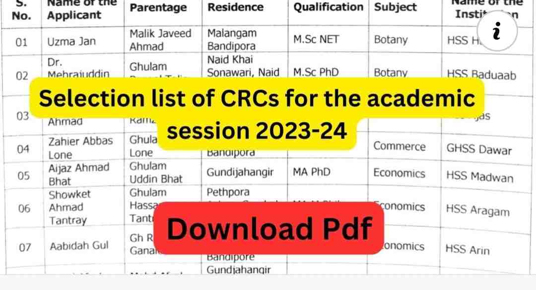 CEO Baramulla – Selection List of Candidates for the Post of CRC’s in different subjects has been released.