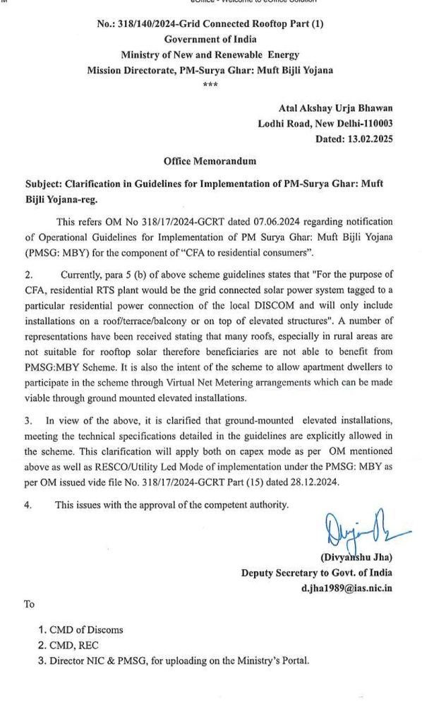 Clarification in Guidelines for Implementation of PM-Surya Ghar: Muft Bijli Yojana