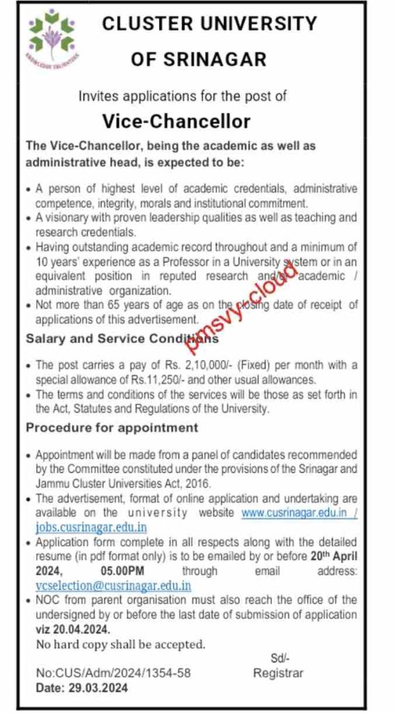 Application form complete in all respects along with the detailed resume (in pdf format only) is to be emailed by or before 20th April 2024, 05:00 PM through the email address: vcselection@cusrinagar.edu.in.