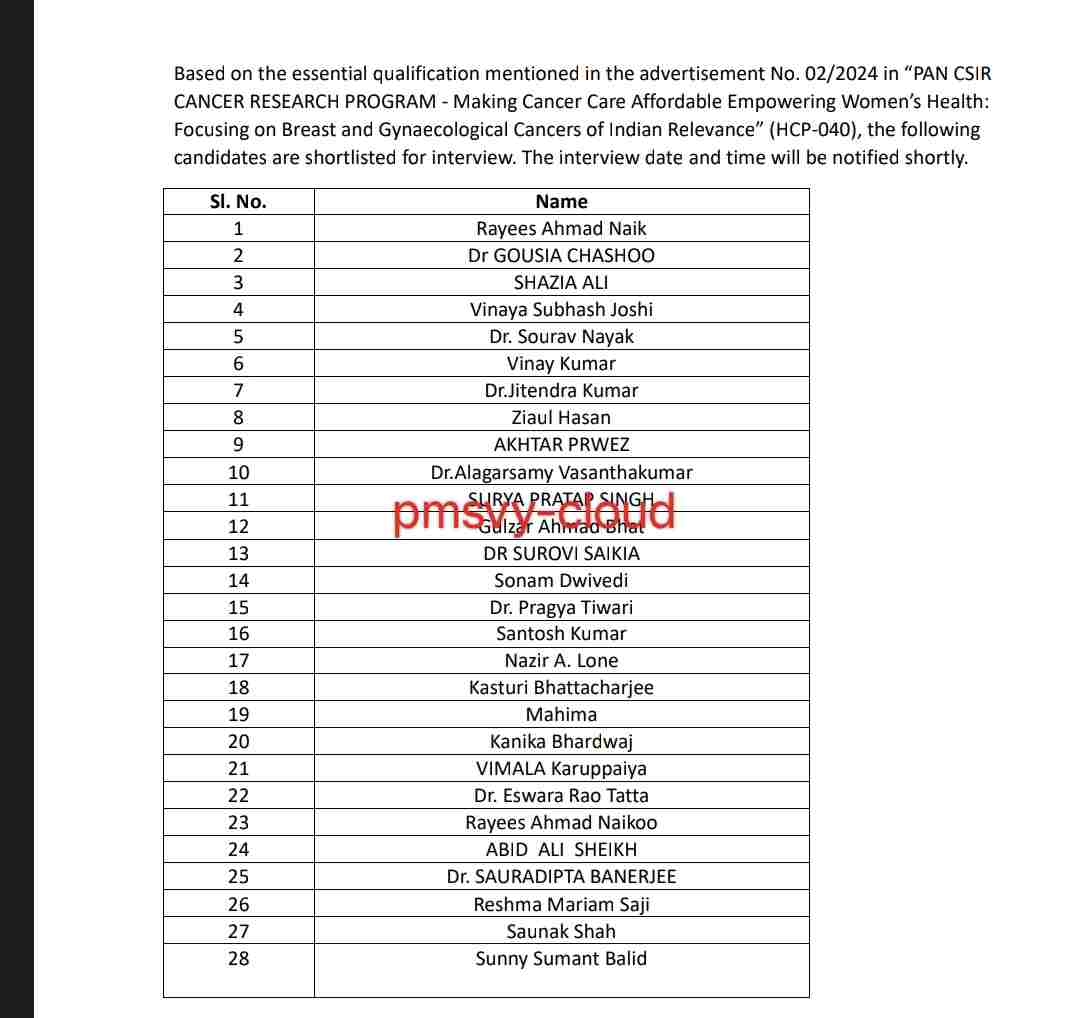 CSIR Shortlisted Candidates for Advertisement No. 02/2024.Based on the essential qualification mentioned in the advertisement No. 02/2024 in “PAN CSIR CANCER RESEARCH PROGRAM – Making Cancer Care Affordable Empowering Women’s Health: