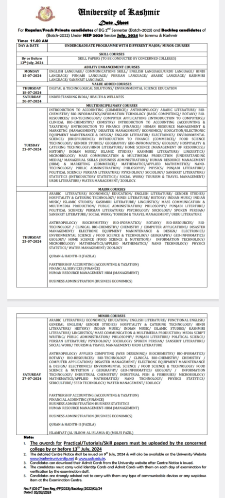 Date Sheet for Regular/Fresh Private candidates of BG 2nd Semester (Batch-2023) and Backlog candidates of (Batch-2022) March 5, 2024 by Dar ZahoorDate Sheet for Regular/Fresh Private candidates of BG 2nd Semester (Batch-2023) and Backlog candidates of (Batch-2022) Under NEP 2020 Session July, 2024 for Jammu & KashmirWhatsApp Group Join Now Leave a Comment Cancel replyCommentName Email Website Save my name, email, and website in this browser for the next time I comment.