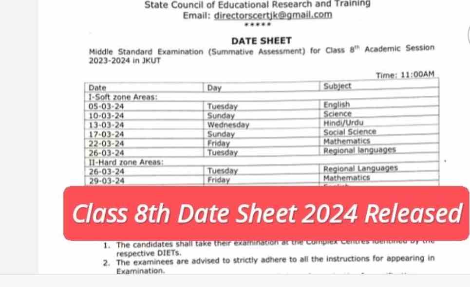 Datesheet for Class 8th Kashmir Division – 2024,DATE SHEETMiddle Standard Examination (Summative Assessment) for Class 8th Academic Session 2023-2024 in JKUT.