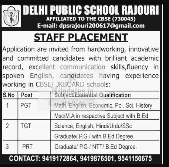 Application are invited from hardworking, innovative and committed candidates with brilliant academic record, excellent communication skills , fluency in spoken English, candidates having experience working in CBSE/ JKBOARD schools.