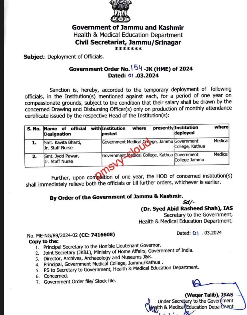 Deployment of Officials in Jammu and Kashmir