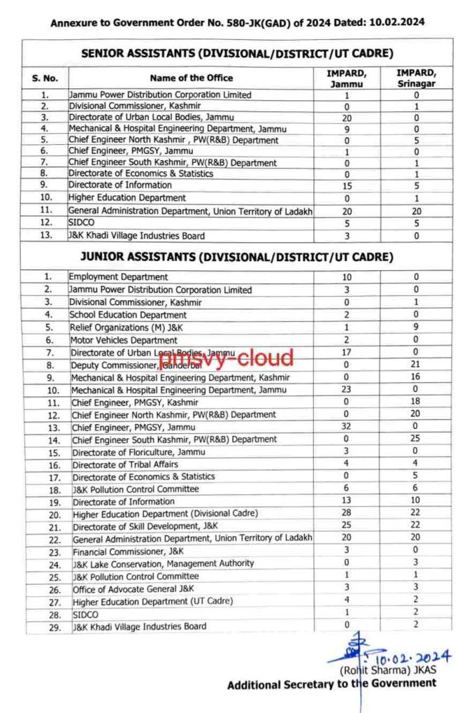 to this Government Order shall depute Senior Assistants/Junior Assistants, as per the number indicated against each, for undergoing J&K Secretariat Assistants