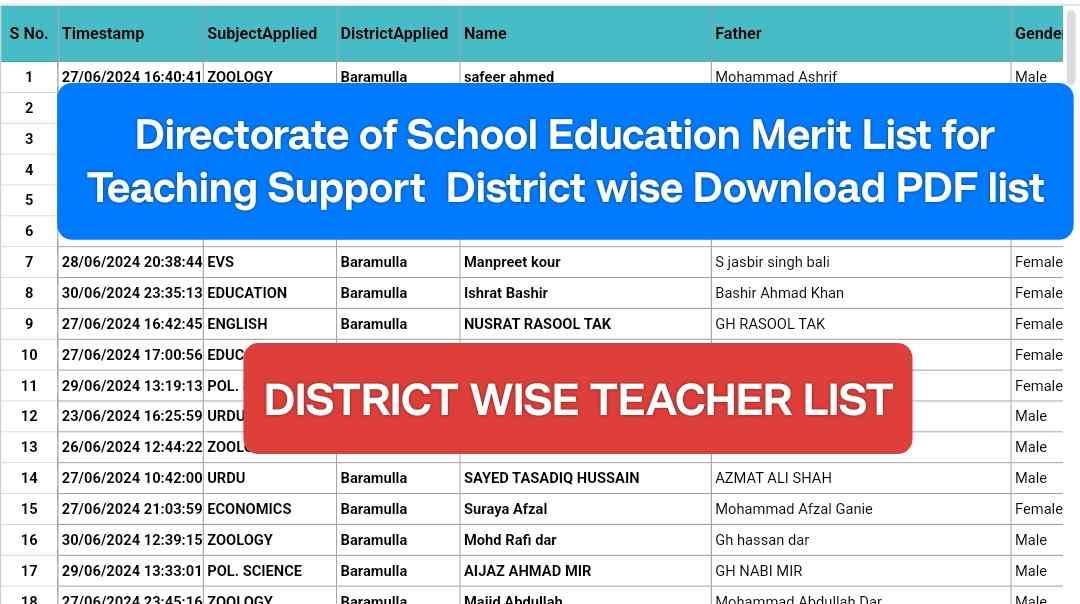 Directorate of School Education Merit List for Teaching Support District wise Download PDF list