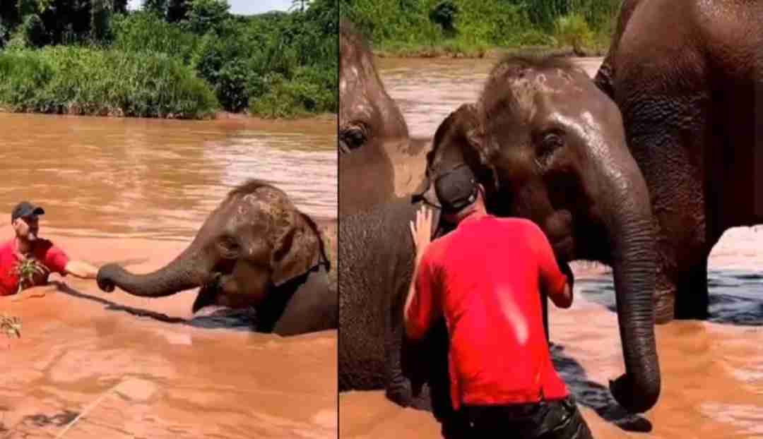 In a touching video that perfectly portrays the bond between elephants and humans, we witness an extraordinary moment of love and compassion. The video captures an elephant and a man standing in a muddy river. As the man finds himself trapped, the elephant extends its trunk and gently holds his hand, coming to his rescue. With incredible strength, the caring elephant pulls the man back to the safety of the shore, where two other giant jumbos stand nearby.