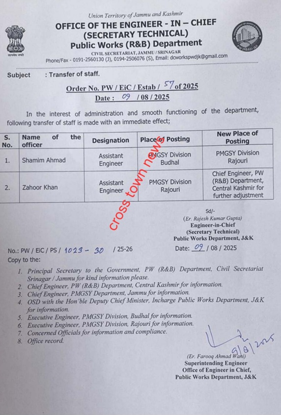 Engineer in Chief ordered transfer & postings of Assistant Engineers August 10, 2025 by Dar ZahoorAug 09: Engineer in Chief ordered transfer & postings of Assistant Engineers, copy with reads as under:-WhatsApp Group Join Now Leave a Comment Cancel replyCommentName Email Website Save my name, email, and website in this browser for the next time I comment.
