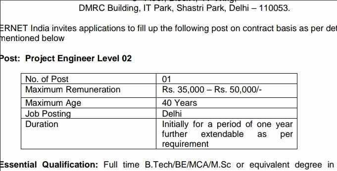 ERNET India, an autonomous scientific society under the administrative control of the Ministry of Electronics & Information Technology, has invited applications to fill up the Project Engineer posts on a contract basis. The selection will be made based on written test/interview/ both, based on the decision of ERNET India in this regard. The appointment against the above-mentioned positions shall be purely on a contract basis, Initially for a period of one year further extendable as per requirement.