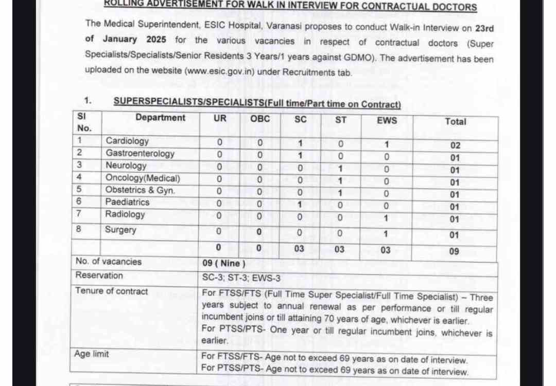 The Employees’ State Insurance Corporation (ESIC) Hospital in Varanasi is inviting qualified candidates to a walk-in interview on January 23, 2025, for 21 contractual positions, including Super Specialists, Specialists, and Senior Residents.