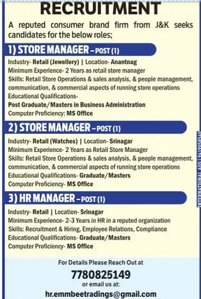 Exciting Job Openings in Kashmir: Store & HR Manager Positions Available: A well-known consumer brand company based in Jammu & Kashmir is inviting applications for the following roles: