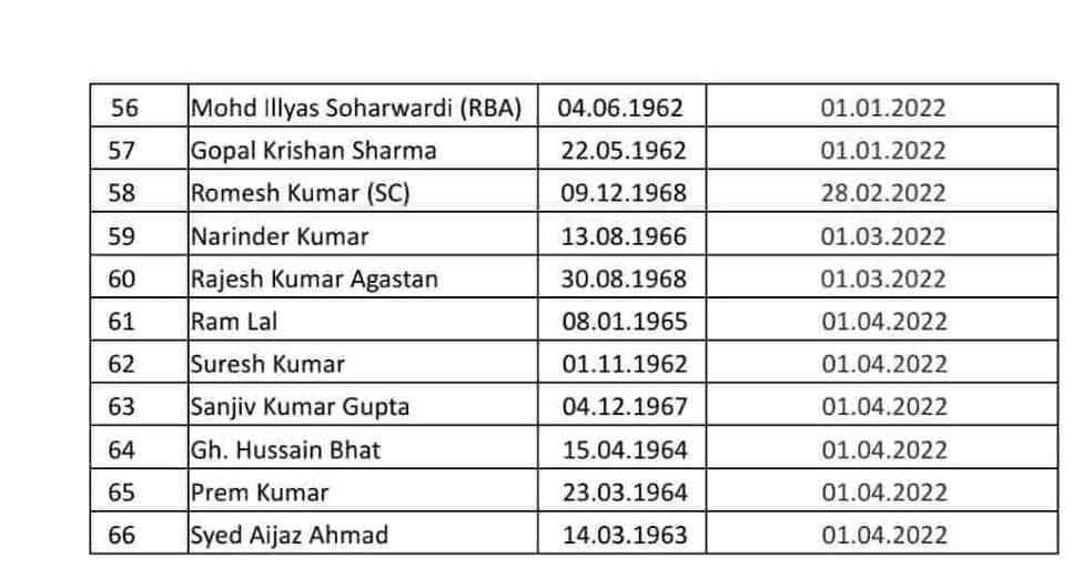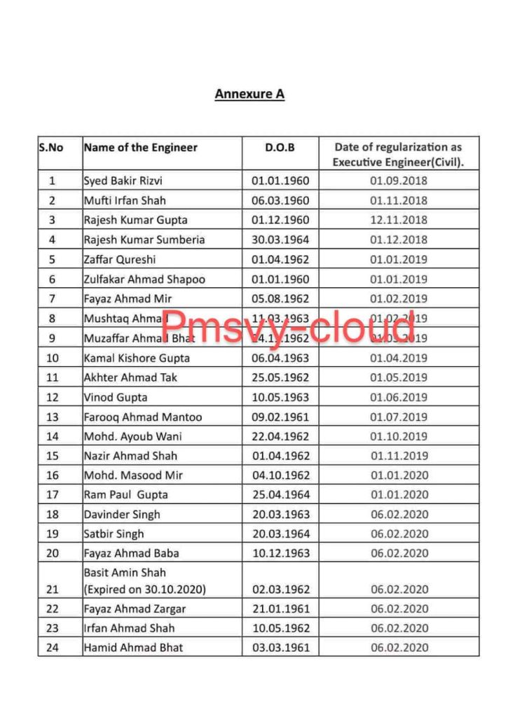 AND WHEREAS, these objections were examined and it has been found that the request made by Er. Quam-ud-din for inclusion of his name in the seniority list of Executive Engineers is not tenable as he has retired from services before the date of occurrence of a vacancy of Executive Engineer. The case of Er. Showkat Ahmad Reshi is being examined separately in the Department. As regards the case of Er. Mehraj-uddin Bhat-II, the necessary documents have been forwarded to the J&K PSC for release of the withheld recommendations at the level of Executive Engineer and as and when the recommendations for his regularization as Executive Engineer are received from the Commission and subsequent order to this effect is issued by the Department, his name shall be included in the seniority list at appropriate place. As regards correction in the name of Er. Aijaz Ahmad Dhar, the request has been examined and found genuine and necessary change has accordingly been made in the seniority list;