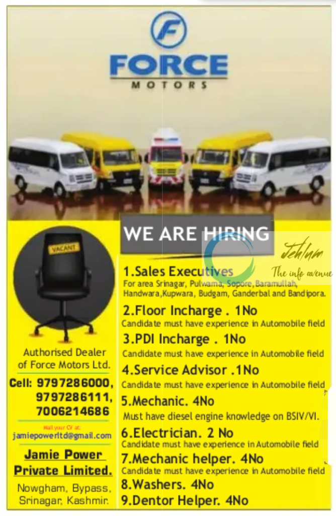 Force Motors Kashmir Jobs in Jamie Power Private Limited