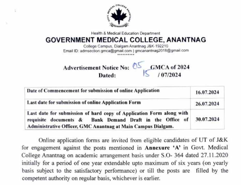 a. Interested eligible candidates can apply online on official website of GMC Anantnag, www.gmcariantnaznet from 16-07-2024.