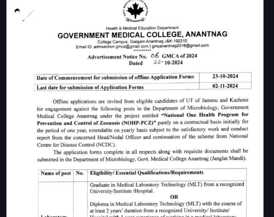 • GMC Anantnag reserves the right to terminate employment if performance is not satisfactory.