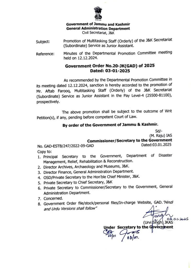 • Mr. Aftab Farooq, a Multitasking Staff member (Orderly) in the J&K Secretariat, has been promoted to the position of Junior Assistant.
