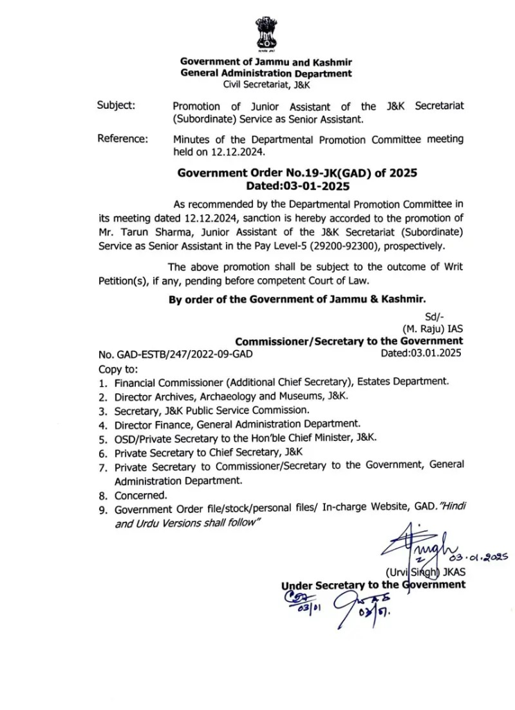 The Government of Jammu and Kashmir has issued two significant promotion orders for its employees, as recommended by the Departmental Promotion Committee in a meeting held on 12 December 2024.