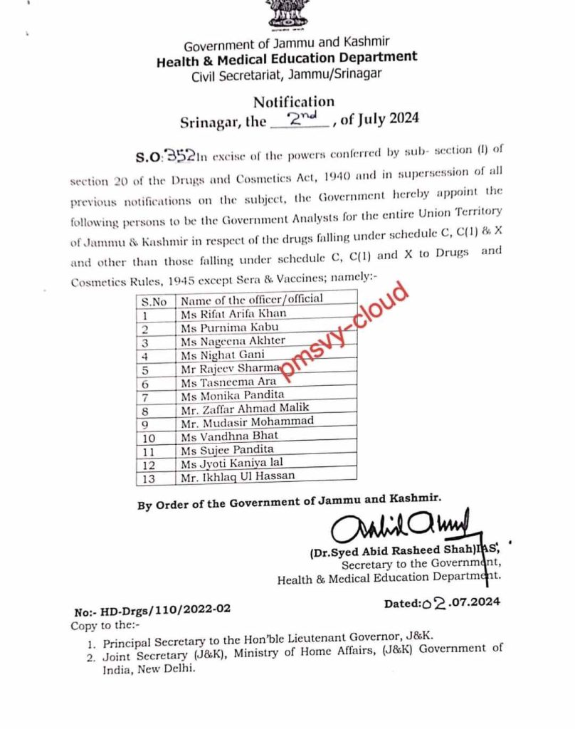 Govt Health and medical Education Department Notification Srinagar, the 2nd , of July 2024