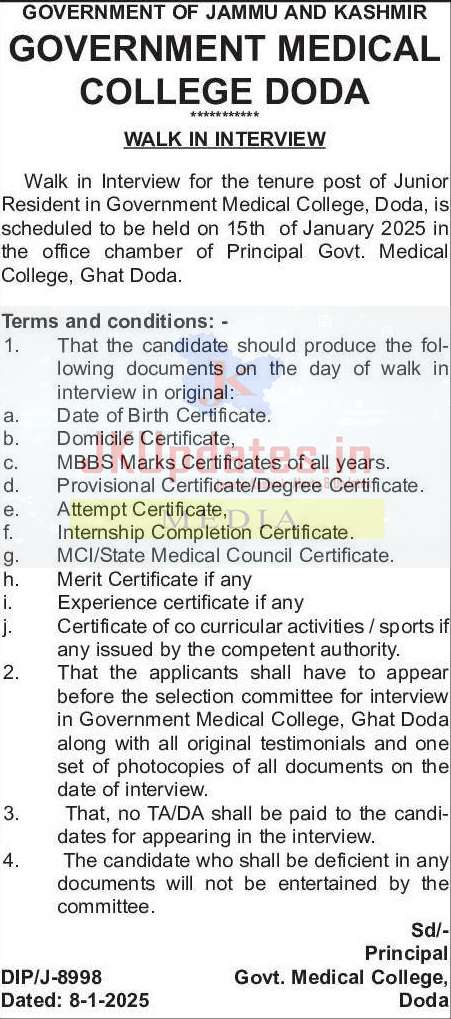 A walk-in interview for the tenure post of Junior Resident in Government Medical College, Doda, will be conducted as per the following details: