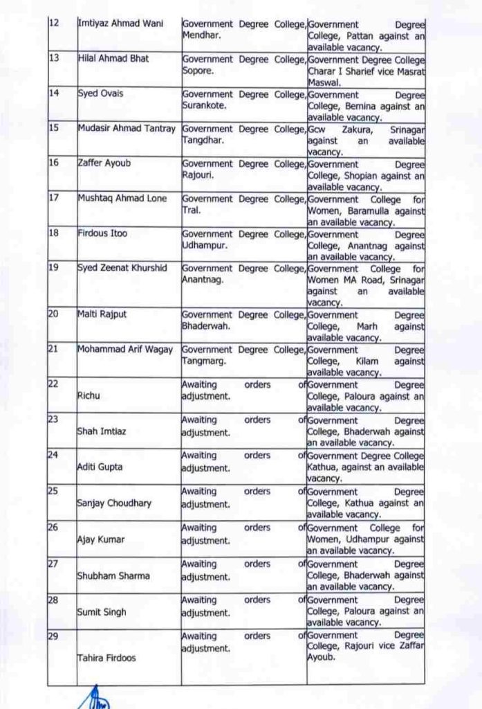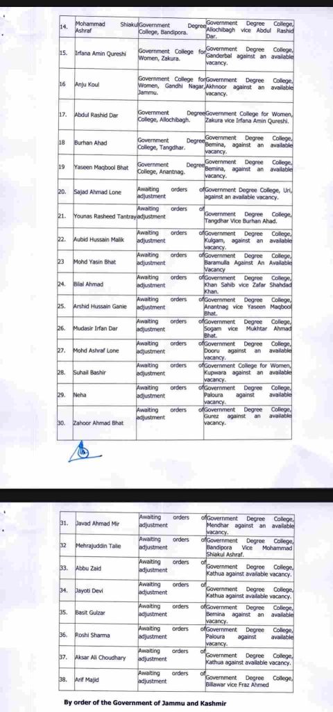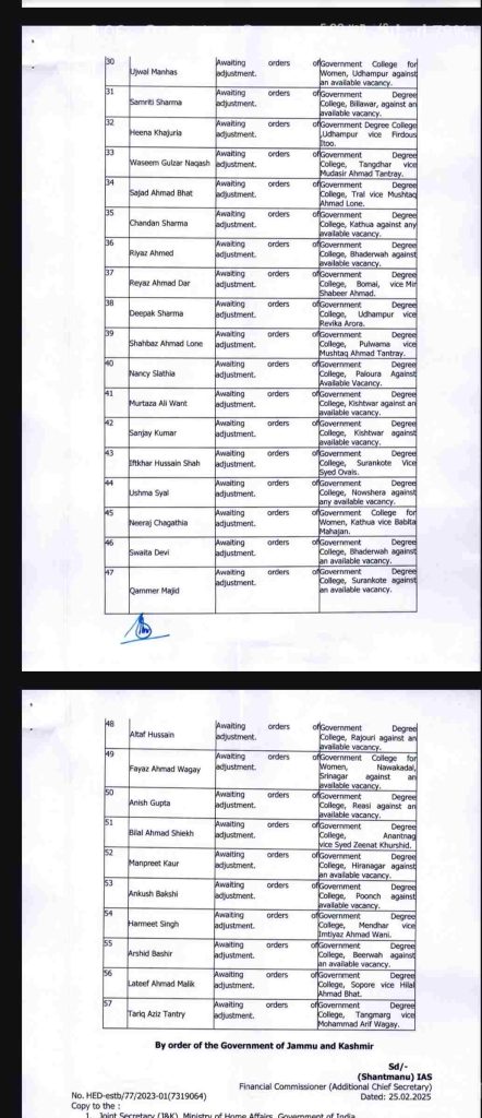 JAMMU, Feb 25: The Higher Education Department (HED) has ordered the transfer, adjustment, and posting of 95 Associate and Assistant Professors from the Botany and Chemistry streams.