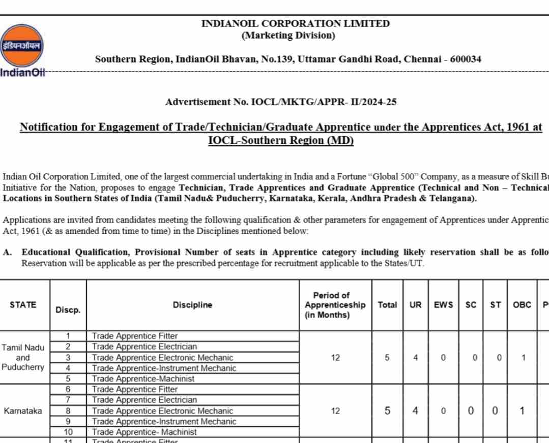 Indian Oil Corporation Recruitment 2025 Indian Oil Corporation Limited (IOCL) has released an official notification for the recruitment of Trade, Technician, and Graduate Apprentices. If you’re seeking a dynamic opportunity with one of India’s leading corporations, this is your chance! Eligible candidates can review the details below and submit their applications online.