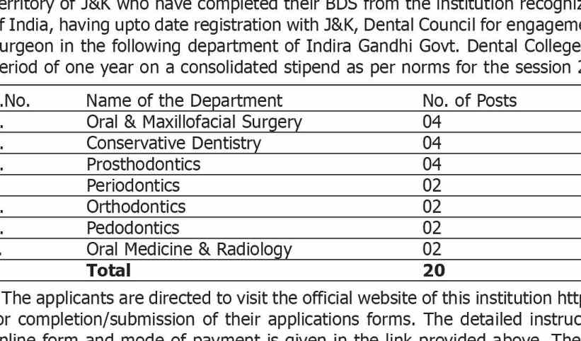 Indira Gandhi Govt Dental College Jammu Recruitment for Various Posts:Online applications are invited from Dental Surgeons hailing from the Union Territory of Jammu and Kashmir, who have completed their BDS from an institution recognized by the Dental Council of India and possess up-to-date registration with the J&K Dental Council. They are sought for engagement as full-time House Surgeons in various departments of the Indira Gandhi Govt. Dental College/Hospital, Jammu for a period of one year, on a consolidated stipend as per norms, for the session 2023-24.