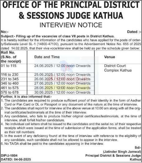π’ Interview Schedule Announced for Orderly/Safaiwala Posts in District Kathua β Check Details Here : The District Administration of Kathua has officially announced the interview schedule for candidates who applied for Class IV posts (Orderly/Safaiwala, Level SL-1: βΉ14,800β47,100) as per Advertisement Notice No. 655 of 2025, dated 14.02.2025.