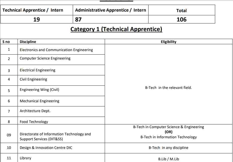 Islamic University of Science and Technology, Awantipora, is offering apprenticeships/internships for Technical and Administrative roles. There are 19 positions available for Technical Apprentice/Intern with a monthly pay of Rs 12,000 and 87 positions for Administrative Apprentice/Intern with a monthly pay of Rs 10,000.