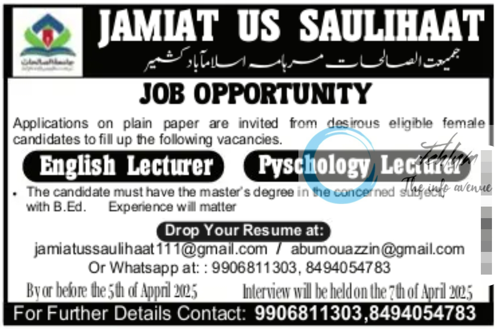 Jamiat Us Saulihaat, Rehama, Islamabad (Anantnag), is inviting applications from eligible female candidates for the following vacancies: