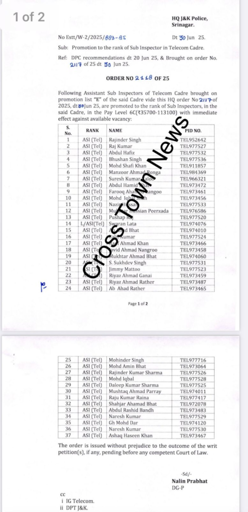 ,July 02: Jammu and Kashmir Police promoted 37 ASIs as Sub Inspectors (Telecom cadre).
