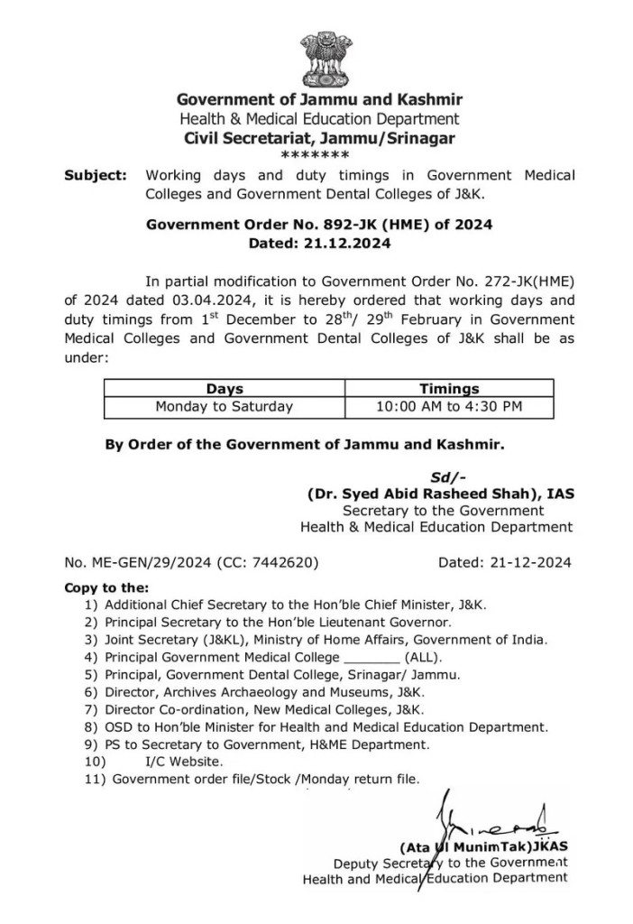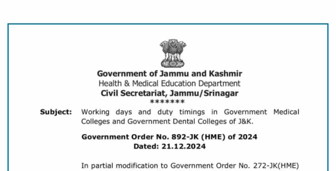 The Government of Jammu and Kashmir has issued a new order (No. 892-JK(HME) of 2024, dated 21.12.2024) revising the working days and duty timings for government medical and dental colleges in the region.