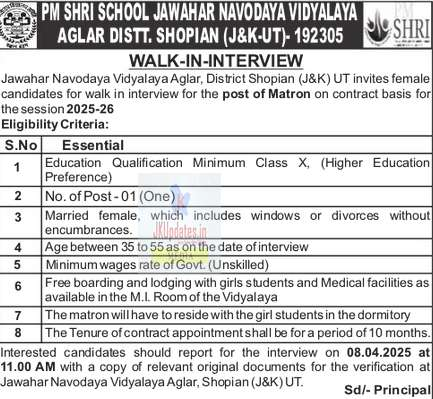 Jawahar Navodaya Vidyalaya (JNV), Aglar, District Shopian (J&K UT) is inviting eligible female candidates for a walk-in interview for the post of Matron on a contractual basis for the academic session 2025–26.