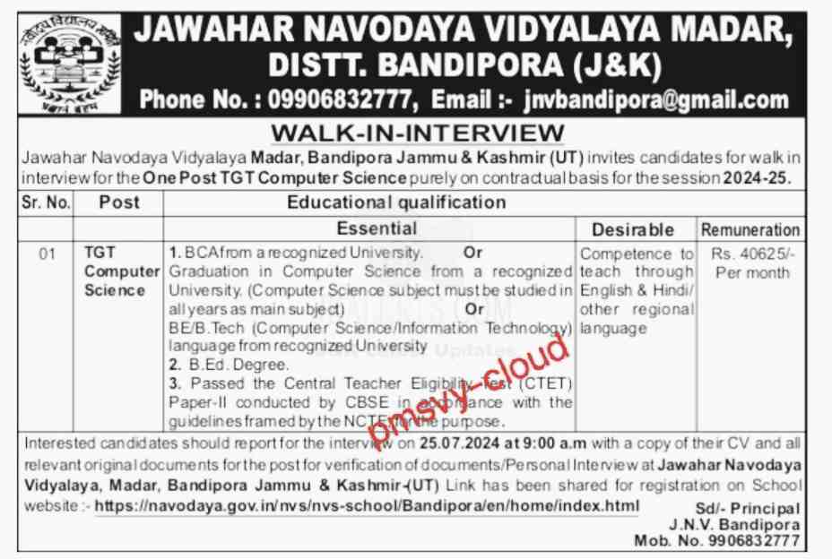 Jawahar Navodaya Vidyalaya Madar, Bandipora Jammu & Kashmir (UT) invites candidates for walk in interview for the One Post TGT Computer Science purely on contractual basis for the session 2024-25.