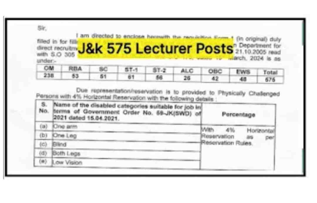 J&K 10+2 Lecturer Vacancies: The Jammu and Kashmir School Education Department has approved 575 (+2 Lecturer) posts across various streams. These vacancies will soon be advertised by the Jammu and Kashmir Public Service Commission (JKPSC). This initiative aims to address staffing shortages in schools and improve the quality of education in the region.